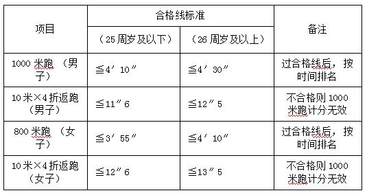 體能測試項目:男子1000米跑、女子800米跑,4×10米往返跑。測試標準參照《公安機關錄用人民警察體能測評項目和標準(暫行)》適當放寬。