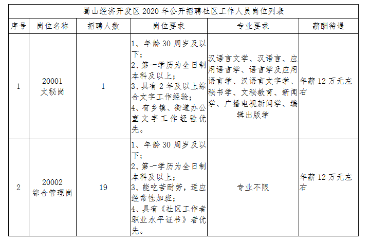合(he)肥蜀山經濟開發區因(yin)工作需(xu)要,現面向社會公開招聘20名社區工(gong)作人員(yuan)。具體如下: