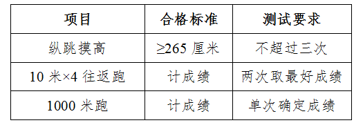 體能測試項目:縱(zong)跳摸高、4×10米(mi)往返跑、1000米(mi)跑。測試標(biao)準參照《公安機關(guan)錄用(yong)人民(min)警察體(ti)能測評項目和(he)標(biao)準》執(zhi)行。