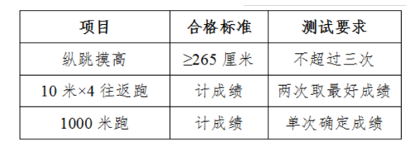 縱跳摸高、4×10米往返跑(pao)、1000米跑(pao)。
