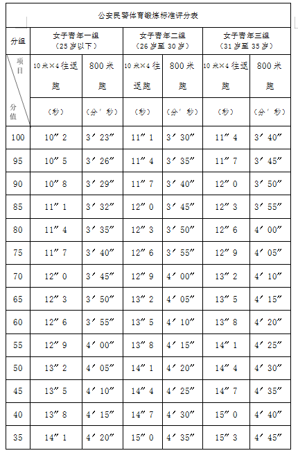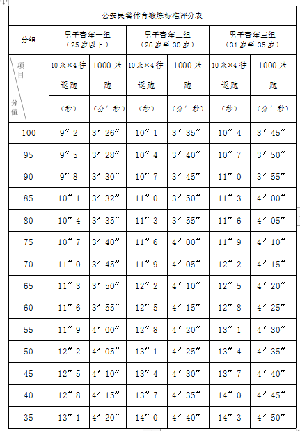 縱跳摸(mo)高不計成(cheng)績,縱跳摸(mo)高達(da)到合(he)格(ge)標(biao)準即視為合(he)格(ge),達(da)不到合(he)格(ge)標(biao)準者取消進入下一個環節資格(ge)。1000米(mi)跑(pao)(pao)(pao)或800米(mi)跑(pao)(pao)(pao)、10米(mi)×4往(wang)返跑(pao)(pao)(pao)每項100分。1000米(mi)跑(pao)(pao)(pao)、10米(mi)×4往(wang)返跑(pao)(pao)(pao)兩(liang)項成(cheng)績之和除以2(體(ti)(ti)測(ce)成(cheng)績保留小(xiao)數點后(hou)兩(liang)位(wei))即為體(ti)(ti)能測(ce)評得分。具體(ti)(ti)評分標準見下表(biao):